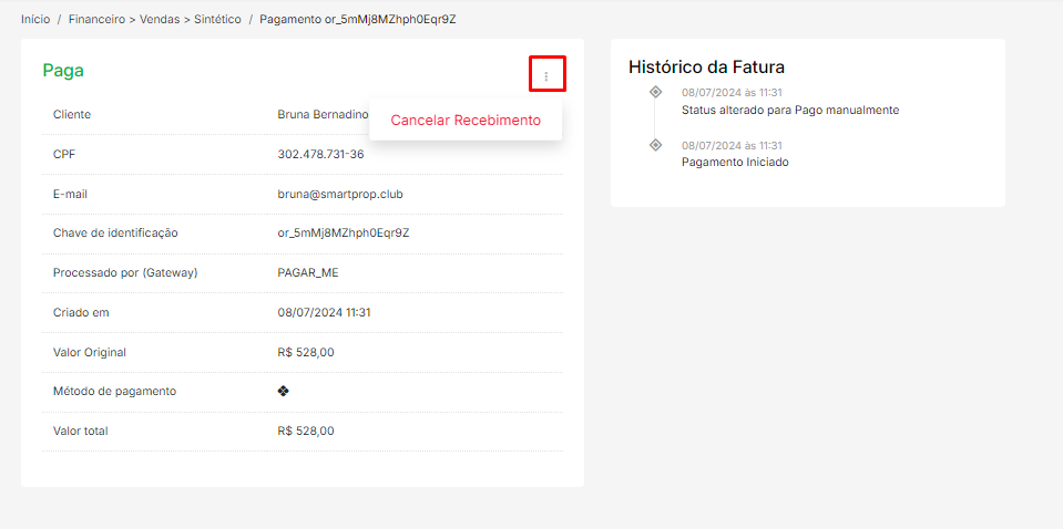 Nesta tela, você pode verificar o pagamento realizado pelo cliente clicando em “Ver Pagamento”, onde todas as informações detalhadas sobre o pagamento serão exibidas. Caso seja necessário, você também tem a opção de “Cancelar Recebimento” da fatura, interrompendo o processo de cobrança ou reembolso, conforme aplicável.