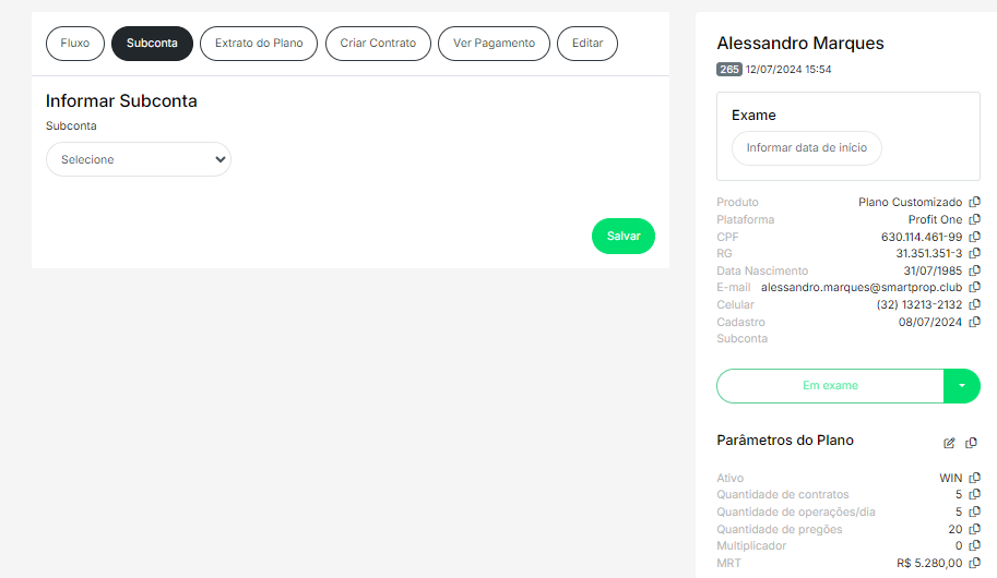 Na seção de SubConta, você tem a opção de escolher entre diferentes opções de plataformas ou tipos de contas, como Ativa ou Modal, para vincular à subconta de um cliente ou trader.