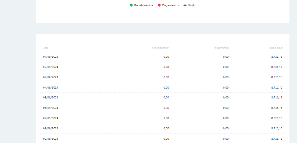 Podemos verificar todo o andamento do caixa diário abaixo, mostrando as informações de data, recebimentos, pagamentos e saldo final.