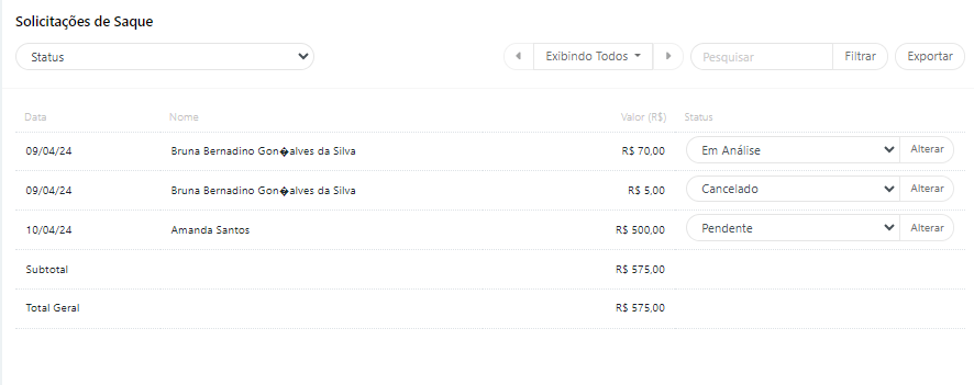 Este módulo permite gerenciar todas as solicitações de saque dos afiliados.