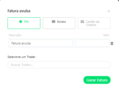 Na opção Fatura Avulsa, conforme visto na imagem, você pode criar uma fatura manualmente. Nessa fatura, o método de pagamento pode ser selecionado entre Pix, Boleto ou Cartão de Crédito, conforme sua preferência ou necessidade do cliente.