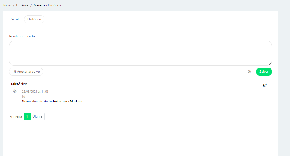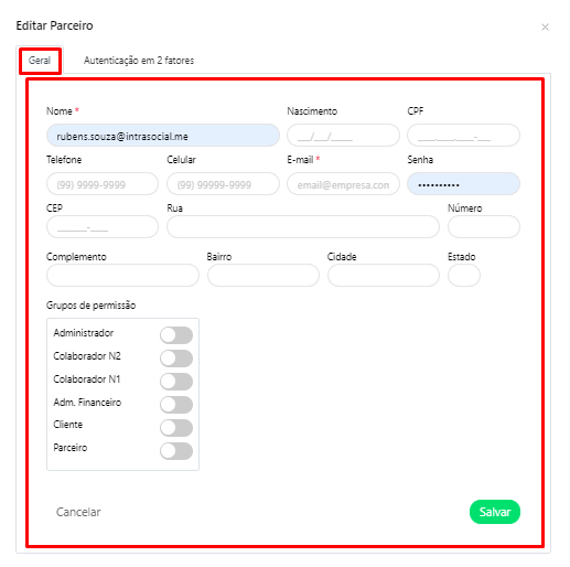 - Grupo de permissão: Nível de permissão no sistema, que pode ser: Administrador, Colaborador N2, Colaborador N1, Adm. Financeiro