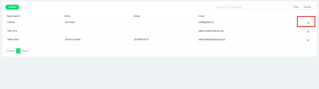 Para visualizar os dados dos parceiros, é necessário clicar no ícone de Olhos. Ao fazer isso, serão exibidas as informações conforme as imagens abaixo: