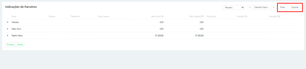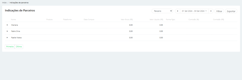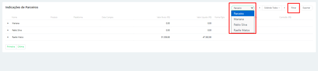 Nesta tela, é possível selecionar o parceiro e gerar suas informações utilizando o menu Filtrar. Isso permite visualizar os detalhes específicos do parceiro selecionado diretamente na tela.