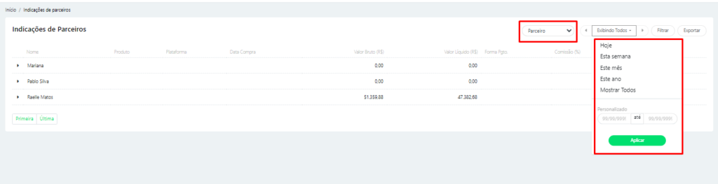 Também é possível informar o período desejado em combinação com a seleção de um parceiro específico, para gerar informações mais precisas e filtradas de acordo com o intervalo de tempo e o parceiro escolhido.