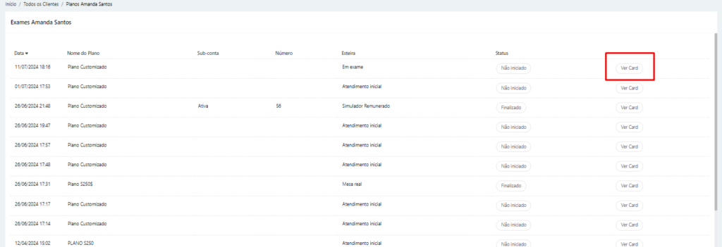 - Ver Card: Botão ou opção para visualizar detalhes completos sobre o cliente ou exame.