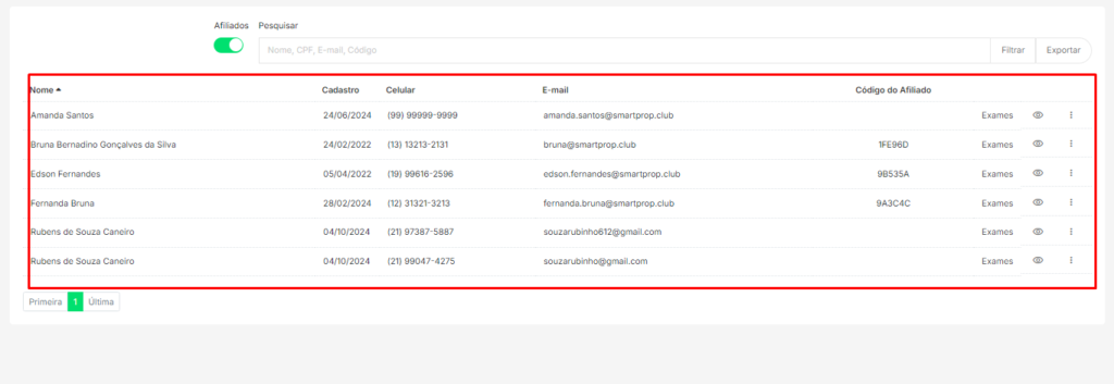 Se você selecionar a opção Afiliados, a tela será ajustada para mostrar apenas os clientes que são afiliados.
