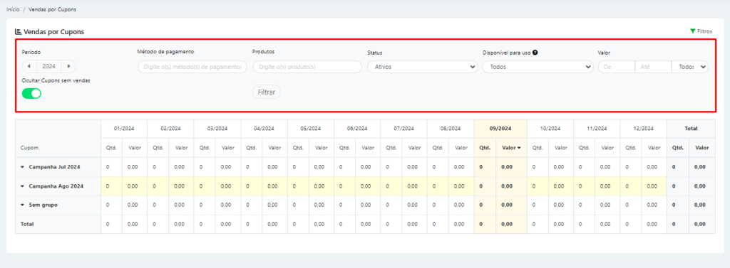 • Ocultar Cupons sem Vendas: Ativado ou Desativado.