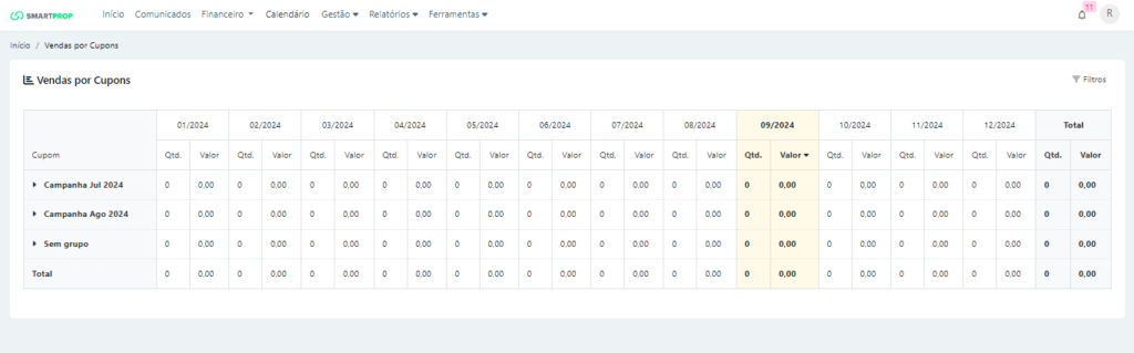 Para acessar esse módulo, siga o caminho: Relatórios > Vendas > Por Cupons.