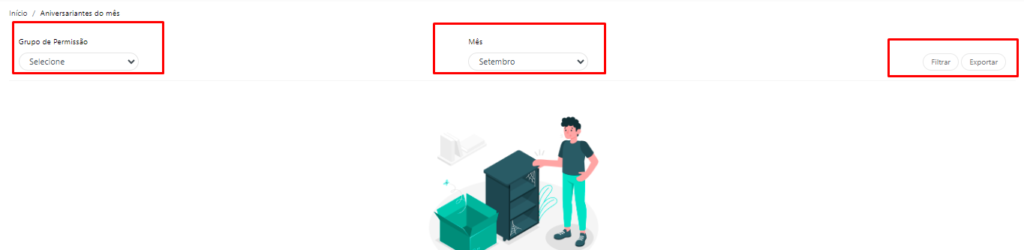 Nesta tela, é possível pesquisar pelos aniversariantes do mês utilizando os seguintes filtros:
