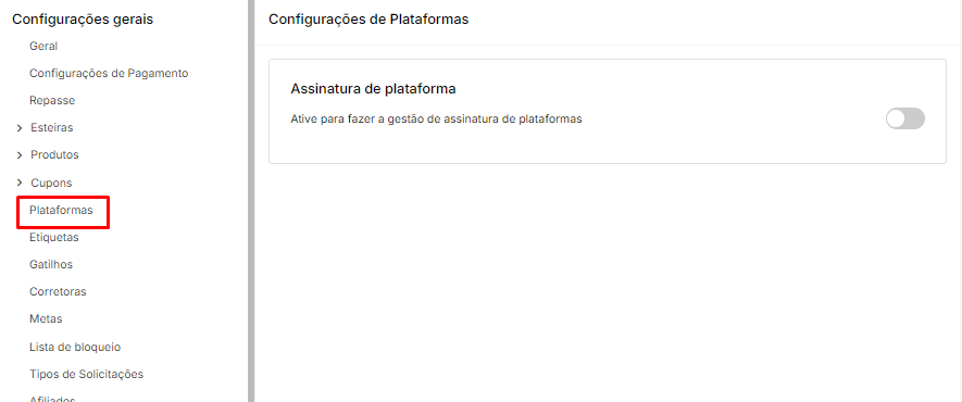 - Ativar Assinatura de Plataforma: Opção para ativar ou desativar a assinatura. Ao ativar, são exibidas as seguintes opções: