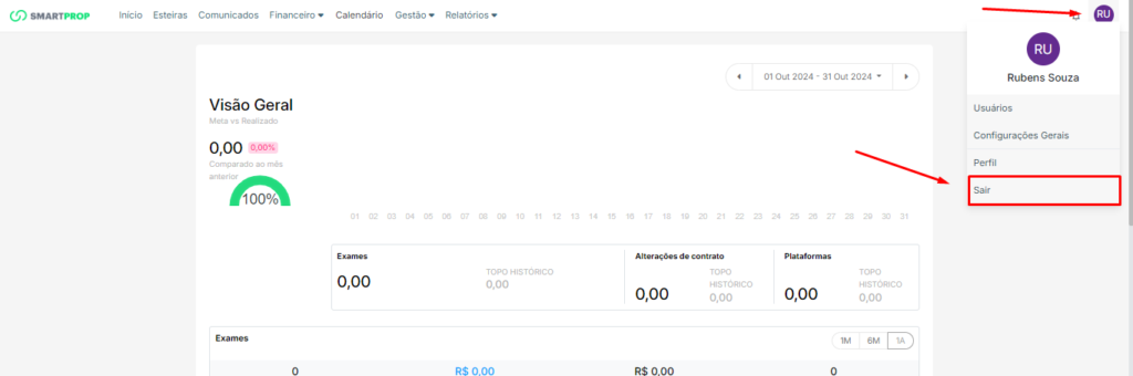 Ao clicar no menu de configurações, conforme indicado pelas setas na ilustração abaixo, você terá a opção de clicar no menu “Sair” para se desconectar do seu login e encerrar sua sessão com segurança.