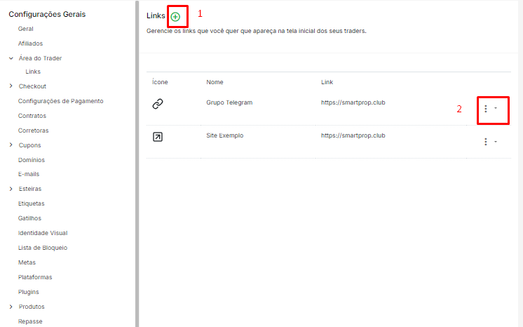 A área de Links permite criar e gerenciar atalhos personalizados para facilitar o acesso a páginas específicas relacionadas ao trader.