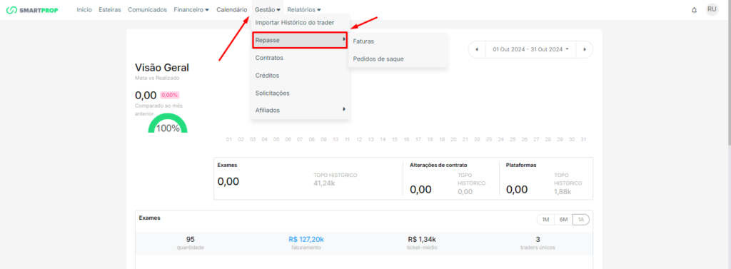 Para acessar a janela de Repasse, siga os passos conforme ilustrado abaixo: Dentro do menu Repasse, estão disponíveis as seguintes informações