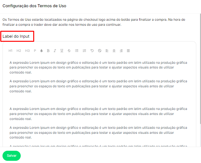 No módulo de configuração dos termos de uso, você pode definir o label do input, que é o texto que aparecerá ao lado da caixa de seleção ou campo de aceite dos termos, como “Eu aceito os termos de uso”.