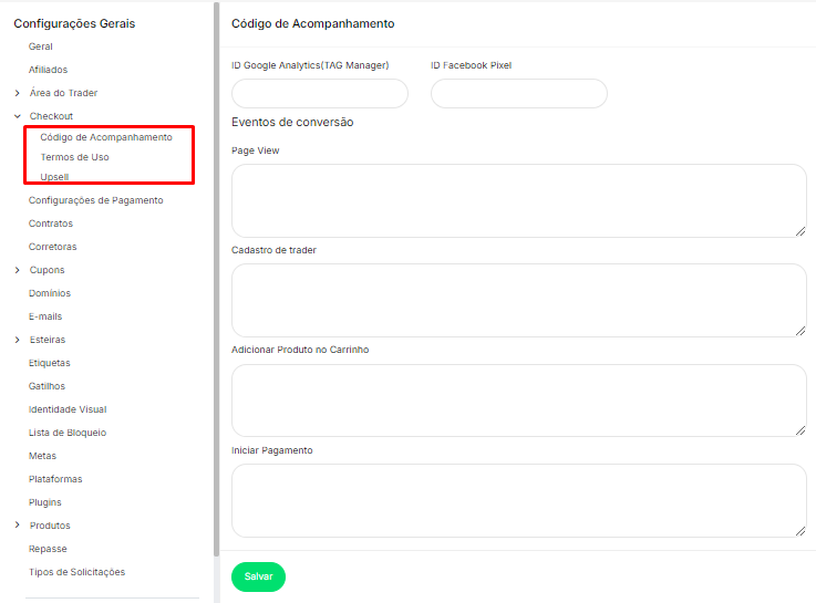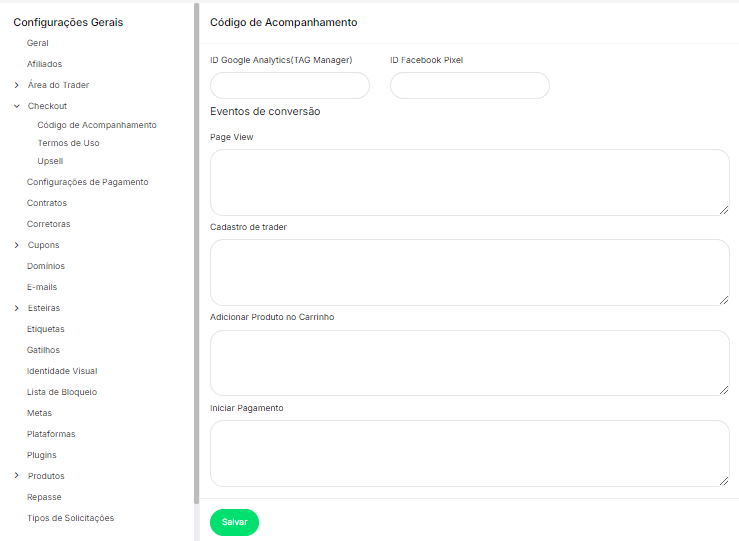 Esta seção permite configurar códigos de rastreamento para monitorar e medir o comportamento de usuários na plataforma, integrando ferramentas de análise e conversão.