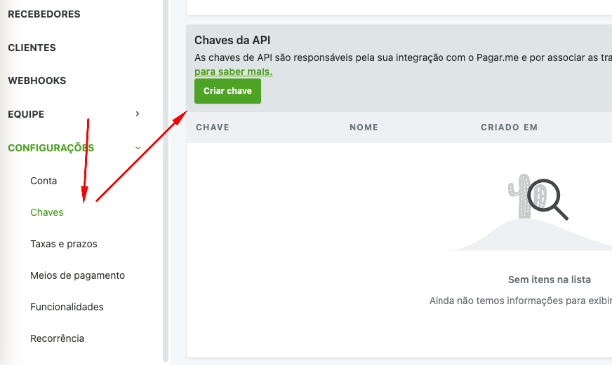 1. Entre na sua conta da Pagar Me, depois vá em Configurações > Chaves > Chaves de API > Cria Chave