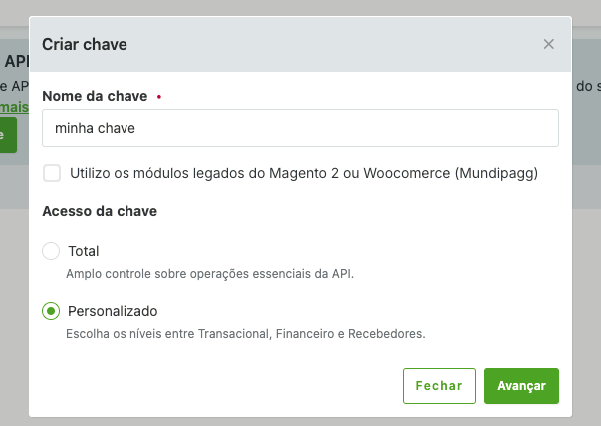2. Em seguida, escreva o nome da sua Chave, coloque em Personalizado e Avançar