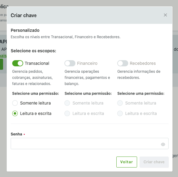 3. Em seguida, deixe selecionada a única opção Transacional, Leitura e Escrita > Insira uma senha forte (ex.: 7372Fee+_.q)