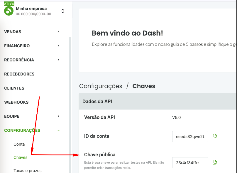 Entre na sua conta do Pagar Me > Configurações > Chaves > Dados da API > Chave pública > Copia a chave.