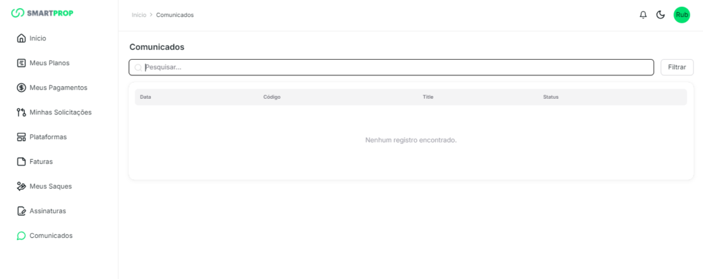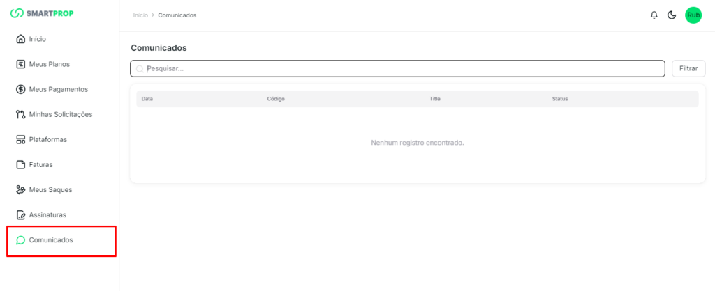 Na área de Comunicados dentro do Trader, você pode pesquisar todos os comunicados que foram enviados. Além disso, é possível aplicar filtros para refinar a pesquisa, utilizando os seguintes critérios: