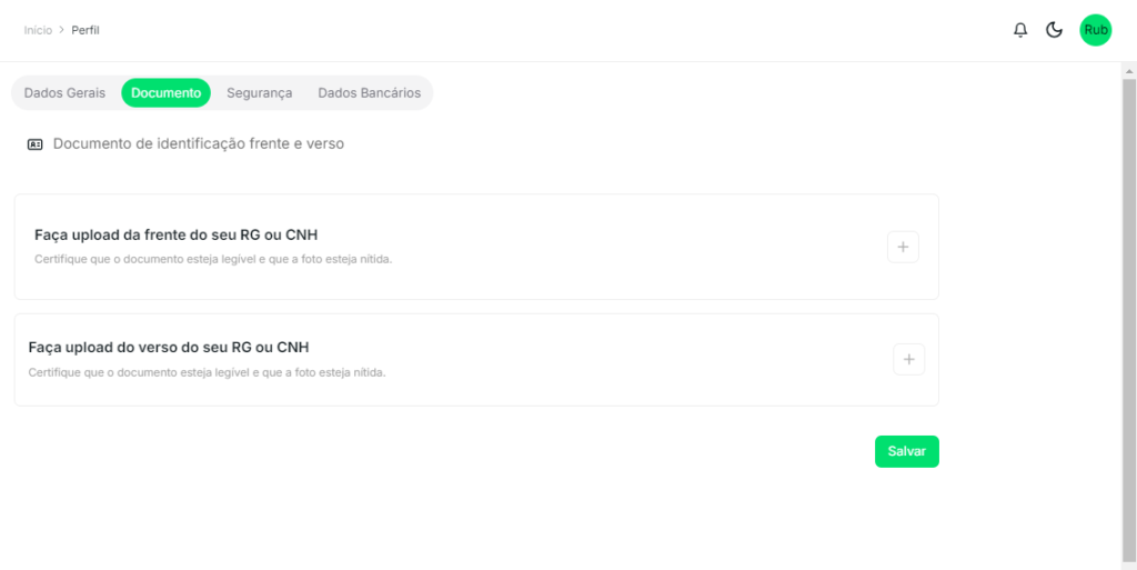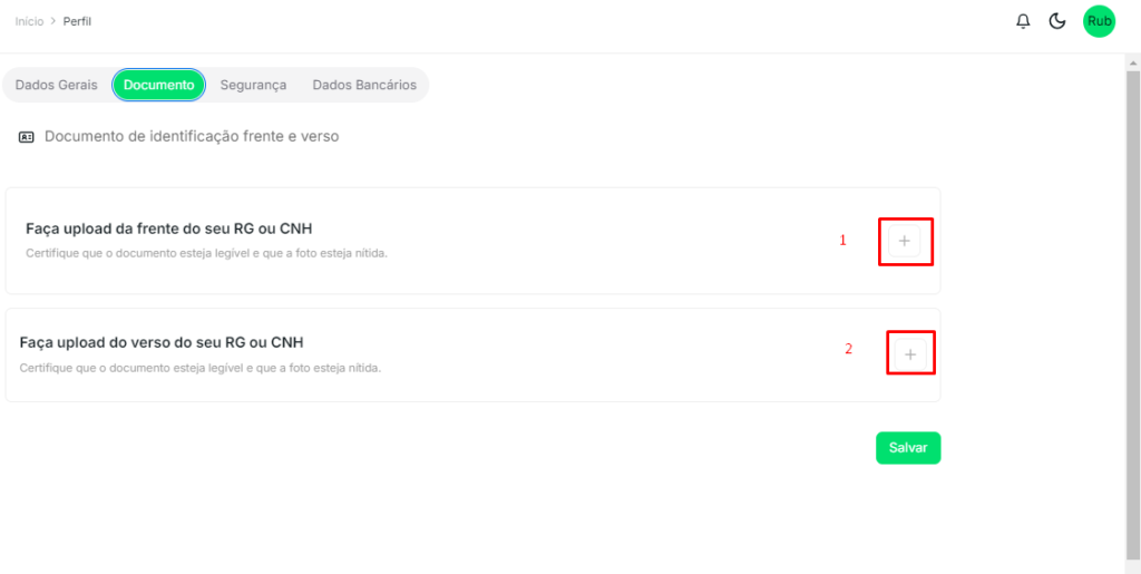 Neste módulo, você pode adicionar seu RG/CNH seguindo as etapas abaixo: