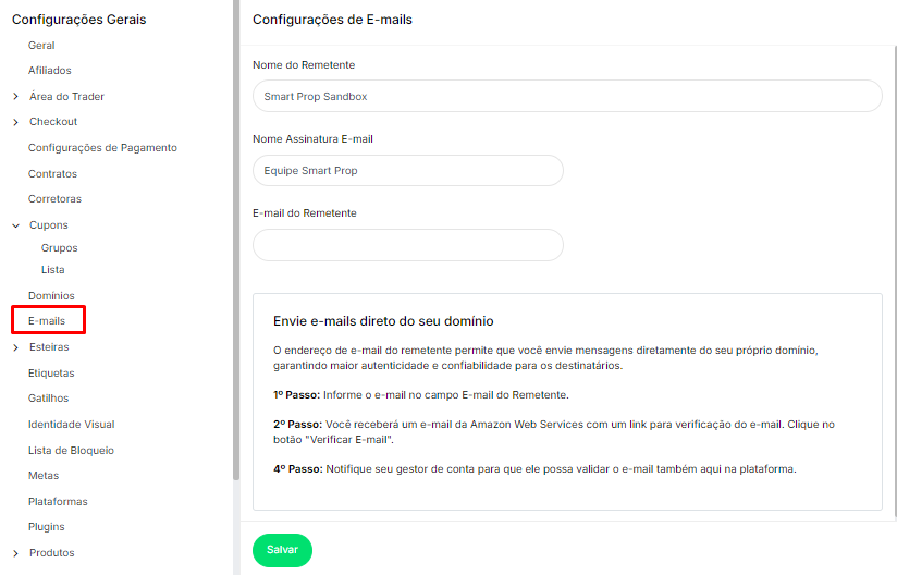 Nesta seção, é possível personalizar os parâmetros básicos para o envio de e-mails pela plataforma.