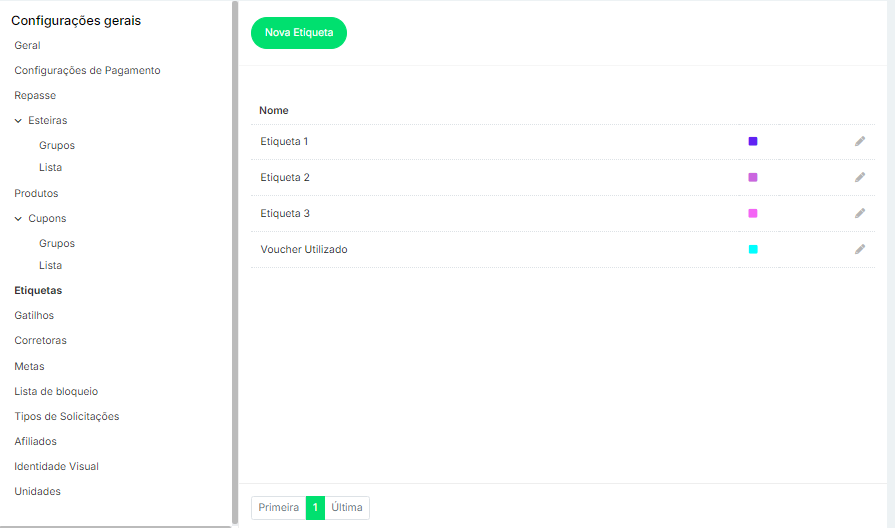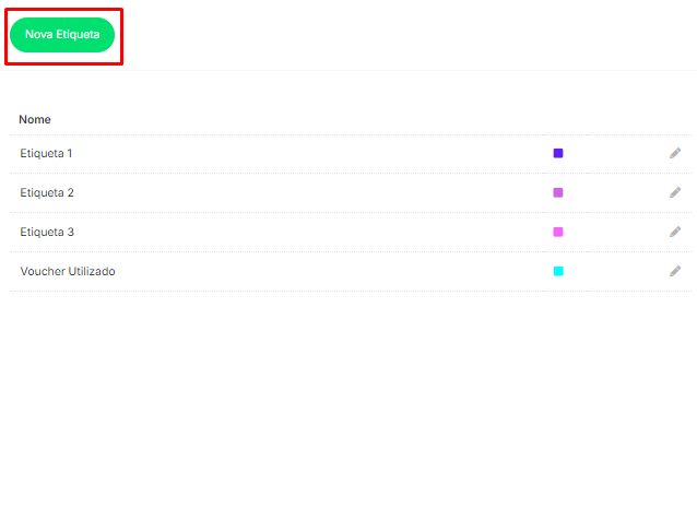- Nome: Nome da etiqueta, que descreve sua função ou categoria (ex.: “Urgente”, “Em Promoção”, “Cliente VIP”).