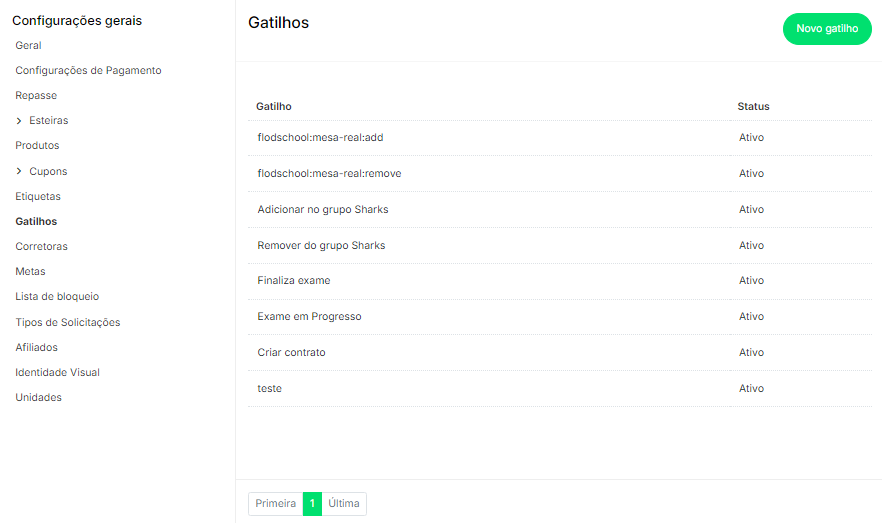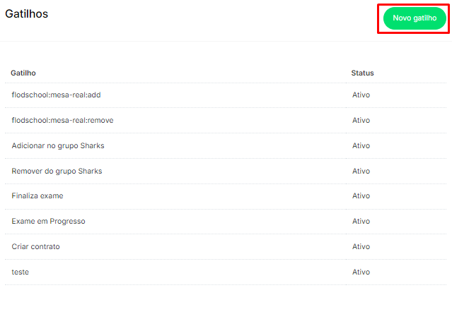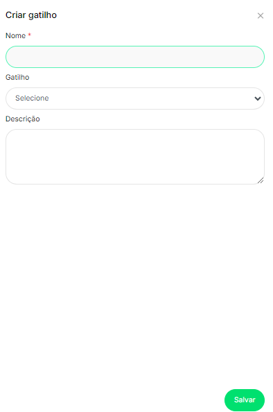 - Nome: Nome do gatilho que descreve sua função ou ação (ex.: “Iniciar Exame”, “Finalizar Contrato”).