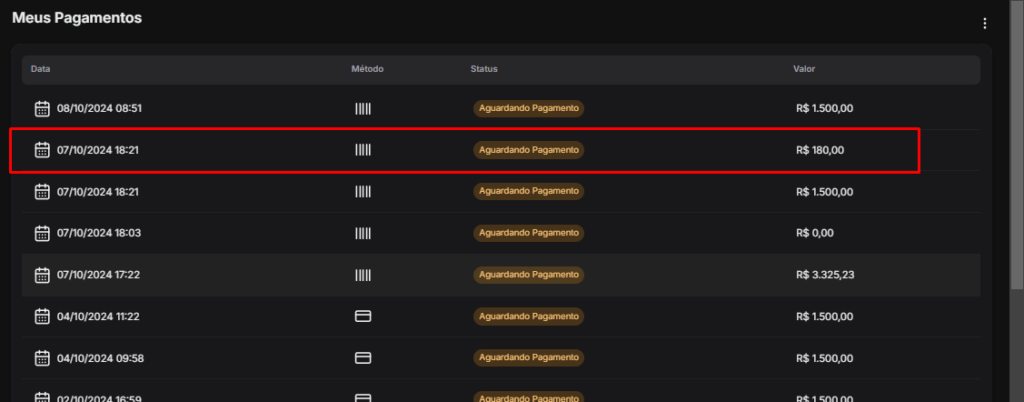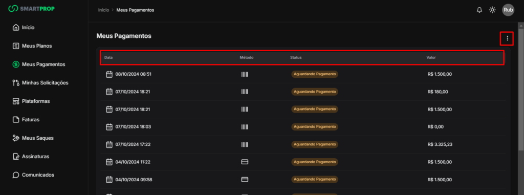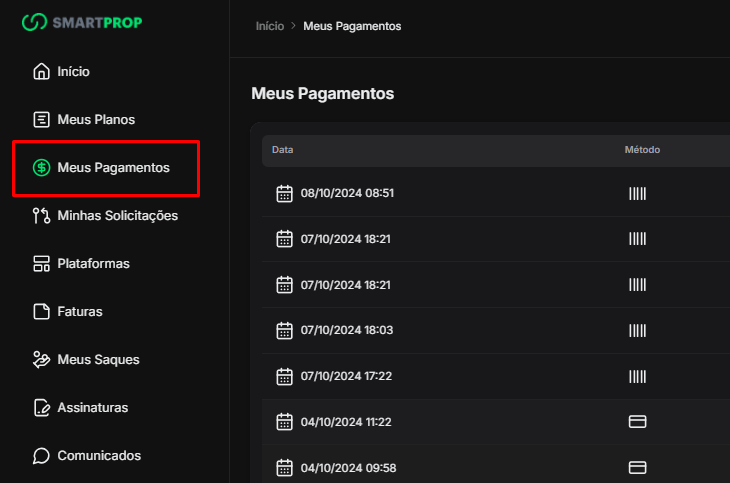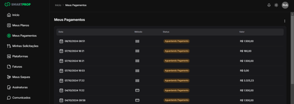 Na tela de Pagamento, é possível visualizar todas as transações efetuadas ou pendentes do trader. As informações exibidas incluem: