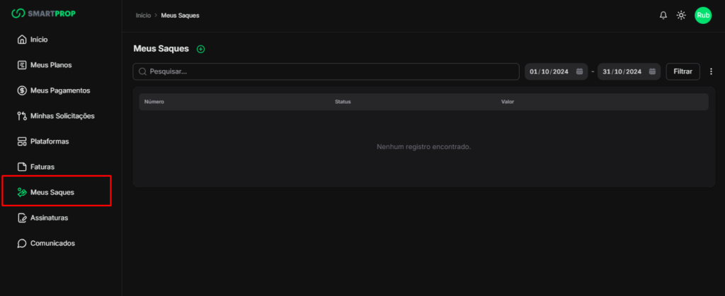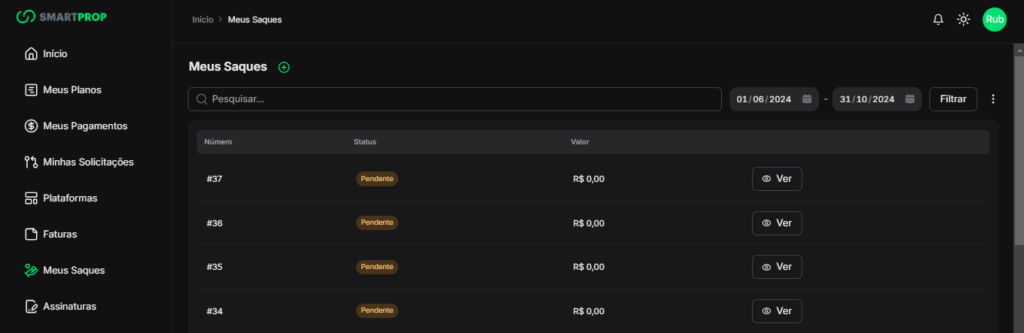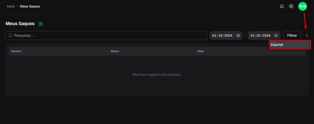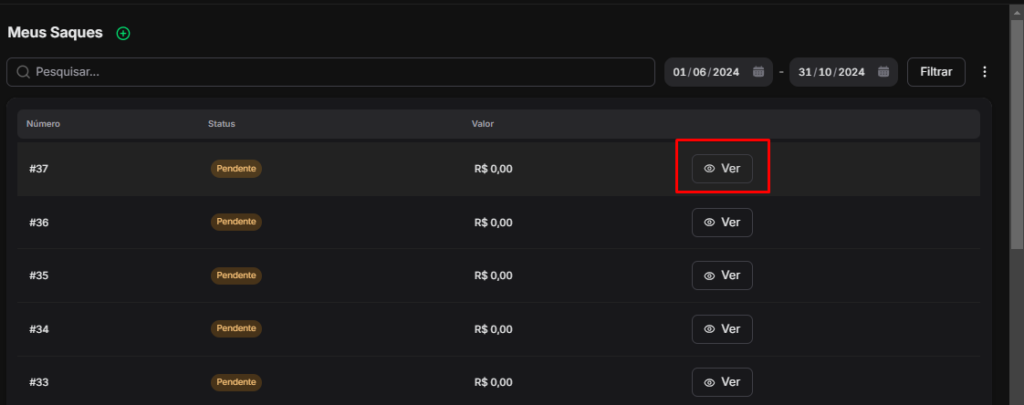 - Período: Filtre as solicitações de saque de acordo com o período desejado (mês, ano, etc.).