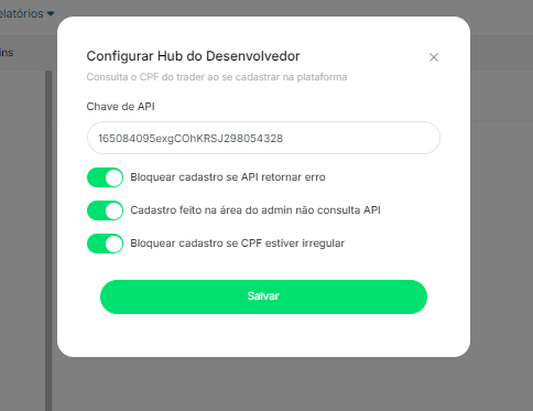 - Cadastro Feito na Área do Admin Não Consulta API: Permite ignorar a validação da API em cadastros manuais.