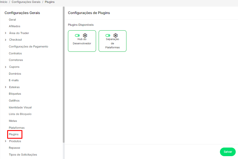 Esta seção permite gerenciar os Plugins Disponíveis, adicionando funcionalidades específicas à plataforma.