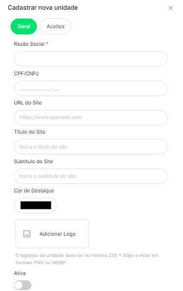 - Adicionar Logo Ativa: A opção de fazer o upload de um logotipo que representará a unidade.